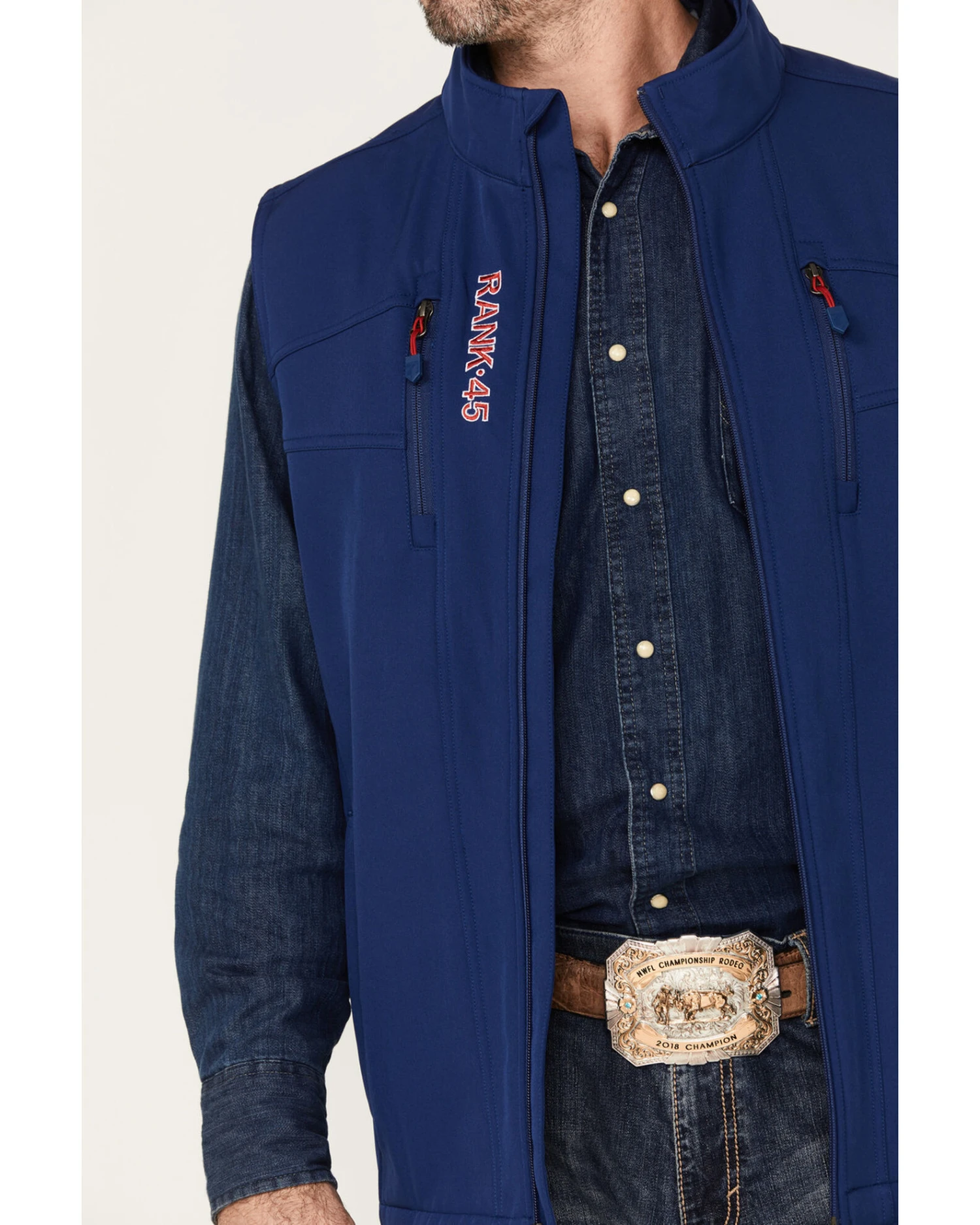 - Red and white embroidered RANK 45 logo on right chest